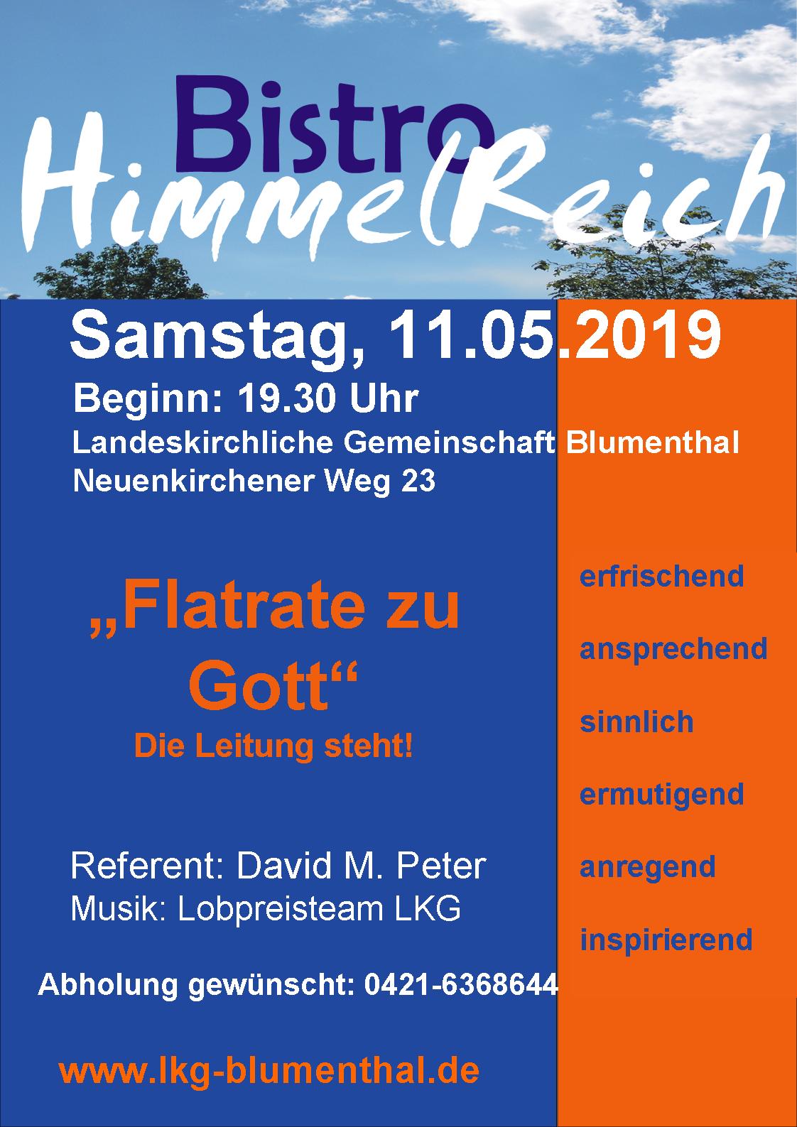Die Vorbereitungen für das nächste Bistro Himmelreich laufen schon auf Hochtouren. Es findet bekanntlich am 11. Mai 2019 um 19.30 Uhr statt. Bis dahin ist es nicht mehr lang hin. Also nicht vergessen. Den Einladungsflyer können Sie hier herunterladen.